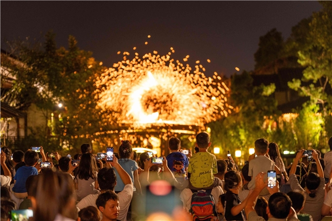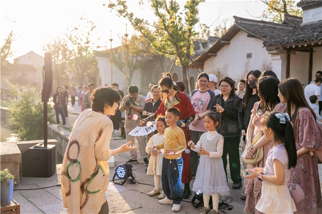 古镇体验更以“动静结合”为特色,营造出张弛有度的度假节奏。“濮院织秋”主题活动通过“遇见宋潮、秋日收藏、织造艺术、疗愈生活”四大单元,打造出丰富立体的体验矩阵:日间可漫步古镇街巷,在颂钵音疗、宋式点茶中静心养性;夜晚则融入“濮院梦华录”超长夜秀,在数十场不间断演绎与近百名NPC构筑的宋韵场景中,体验“我在宋朝躺赢的一天”。这种从静谧疗愈到沉浸互动的自如切换,让游客在动静平衡中真正深入古镇肌理,感受跨越古今的时尚生活方式。