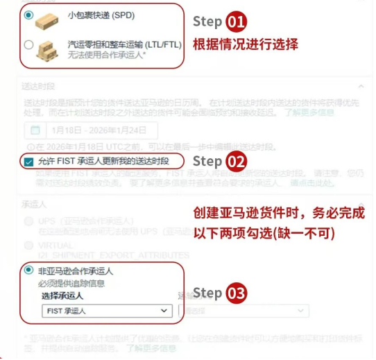 ❗❗注意:亚马逊已将创建新货件时的页面进行了部分调整,FIST承运商统一归为“FIST承运人”选项,卖家无需在列表中逐一查找。该变化不影响正常功能的使用,卖家朋友可以放心选择“FIST承运人”选项,待一八供应链揽收货件后,将会及时为您更新并推送信息。