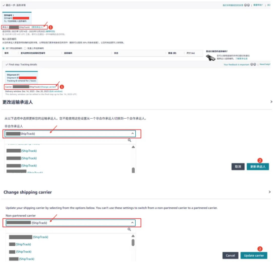 若操作中遇到【允许FIST承运人更新我的送达时段】选项未显示或无法勾选的情况,可能是承运商未正确关联。一般可通过在“追踪详情”页面选择【更改承运人】为“FIST承运人”或您使用的具体FIST承运商名称来激活该选项。更新完成后,再重复上述勾选操作。
