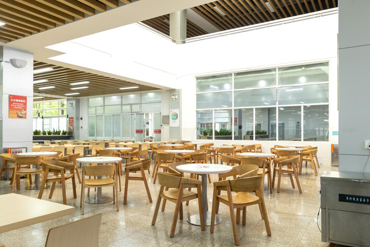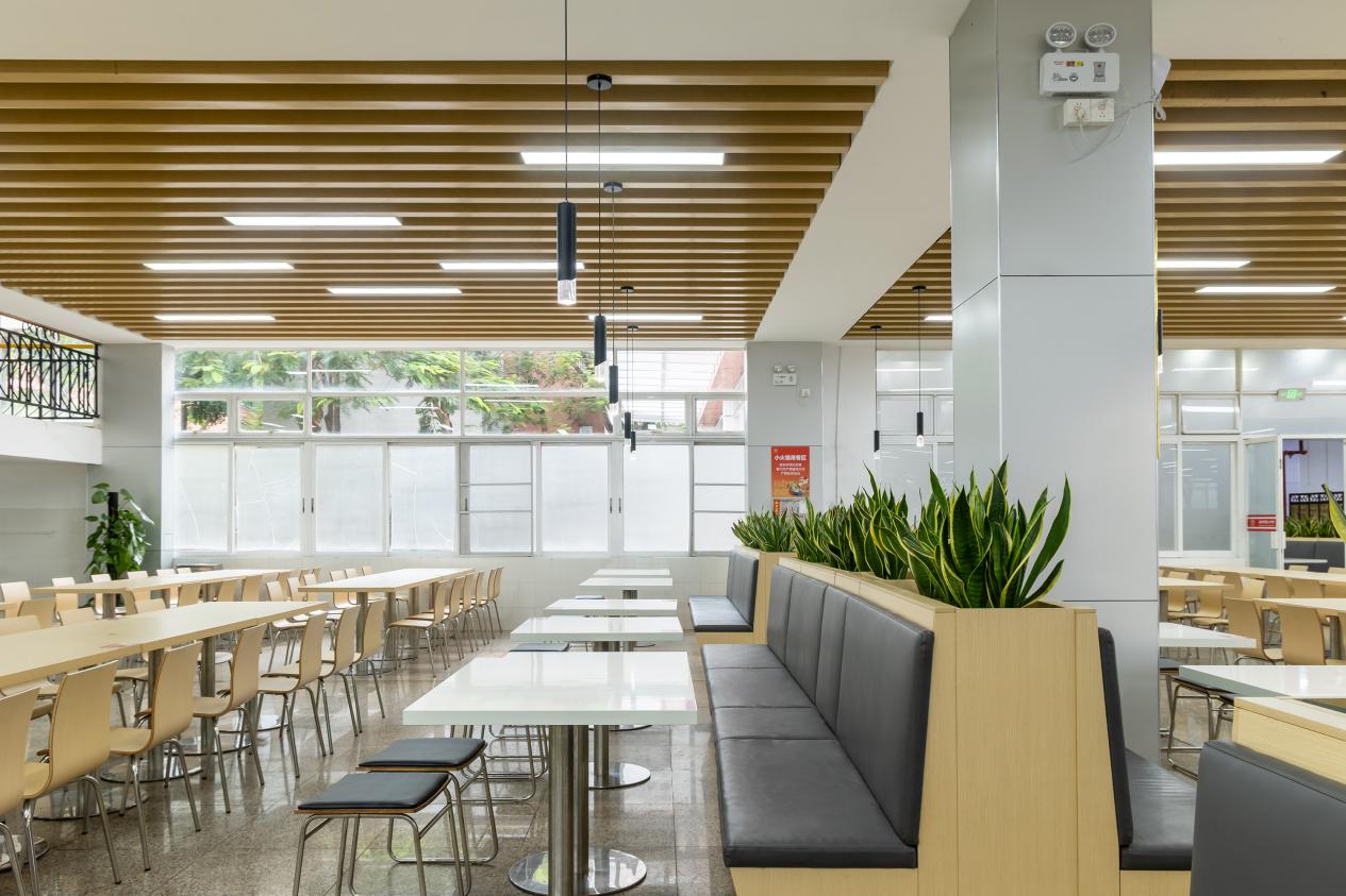 这个食堂通过通透的布局、自然光的引入及木质元素的运用营造温馨基调;家具配置则兼顾实用性与舒适性,并通过明确的功能分区,满足多元用餐需求。整体设计既符合校园公共空间的高效属性,又以细节关怀提升了师生的用餐体验。