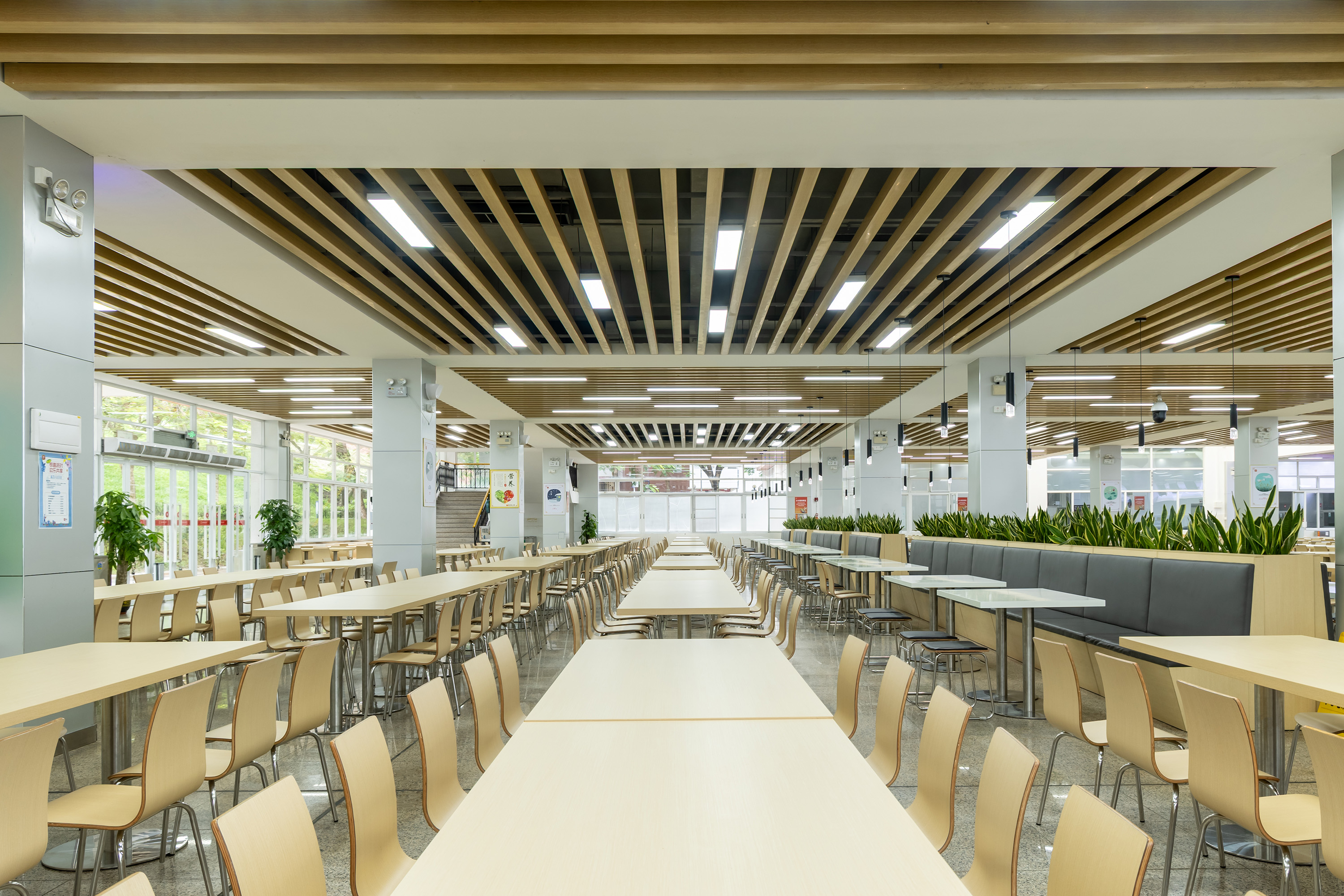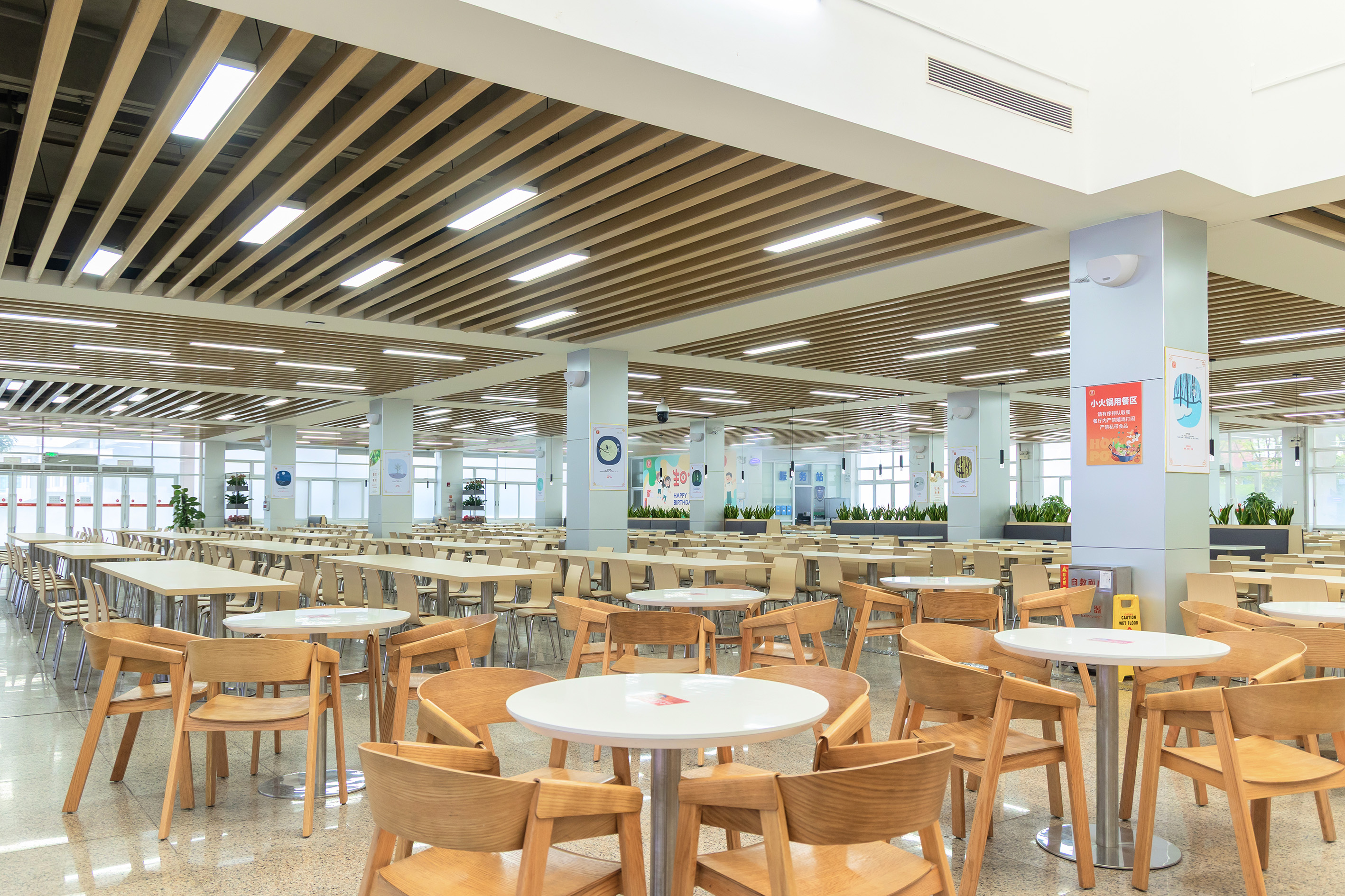 空间材质主要采用“自然系”风格:地面大多选用浅色大理石,表面光滑易于清洁,且能营造出明亮的视觉效果;天花板借助木质格栅增添层次感与温馨感;立柱、墙面等公共区域采用浅灰、白色等低饱和度色调,使整体视觉效果统一而不杂乱。天花板的木质格栅、浅木色的桌椅以及木质隔断/花槽等,运用自然材质中和了食堂的“公共感”,传递出温暖亲切的氛围。