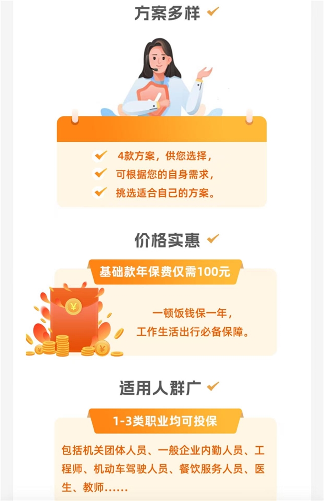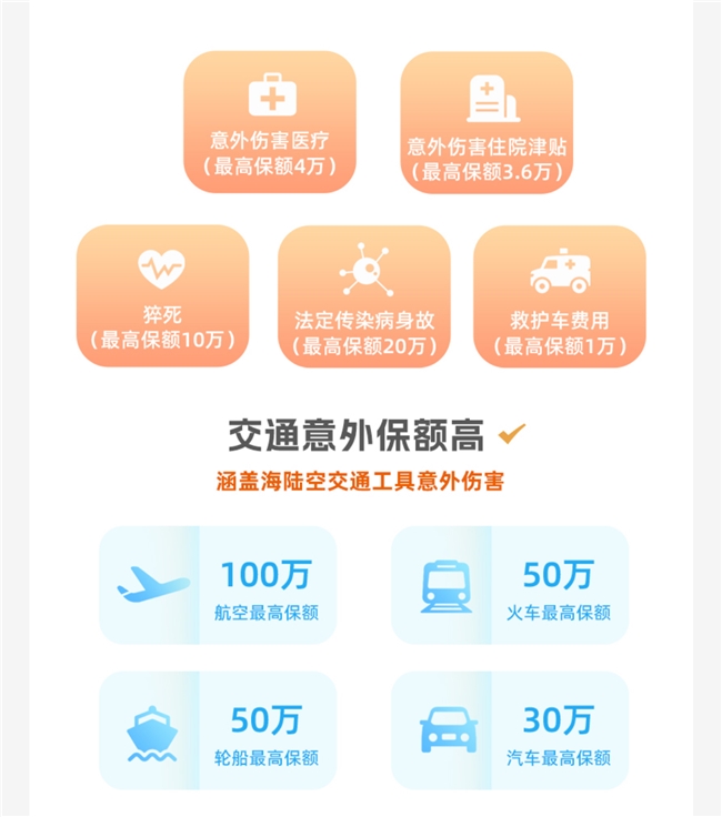 1、保障范围广:意外伤害身故/伤残、意外伤害医疗、意外伤害住院津贴、海陆空交通工具意外伤害保险;