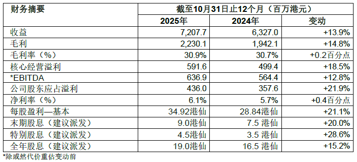 董事会建议派付末期股息(「末期股息」)每股普通股9.0港仙(二零二四年:末期股息7.5港仙)及特别股息(「特别股息」,连同末期股息统称为「股息」)每股普通股4.5港仙(二零二四年:特别股息3.5港仙)。连同中期股息每股普通股5.5港仙(二零二四年:5.5港仙),截至二零二五年十月三十一日止年度,股息合共为每股普通股19.0港仙(二零二四年:16.5港仙)。