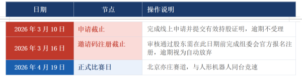 值得注意的是,首程控股此次将赛事名额作为股东专属福利开放申请,符合条件的股东可免除官方抽签环节直接报名参赛。这一举措被市场视为公司在投资者关系管理上的创新尝试,也体现了其机器人产业生态向股东开放的理念。